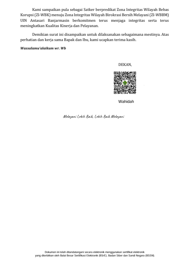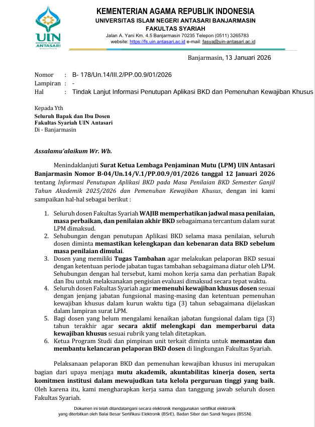 Banjarmasin – Lembaga Penjaminan Mutu (LPM) UIN Antasari Banjarmasin telah menerbitkan Surat Nomor B-04/Un.14/V.1/PP.00.9/01/2026 tanggal 12 Januari 2026 pemberitahuan terkait penutupan Aplikasi Beban Kerja Dosen (BKD) pada masa penilaian BKD Semester Ganjil Tahun Akademik 2025/2026. Informasi ini ditujukan kepada seluruh pimpinan fakultas untuk selanjutnya disosialisasikan kepada para dosen.