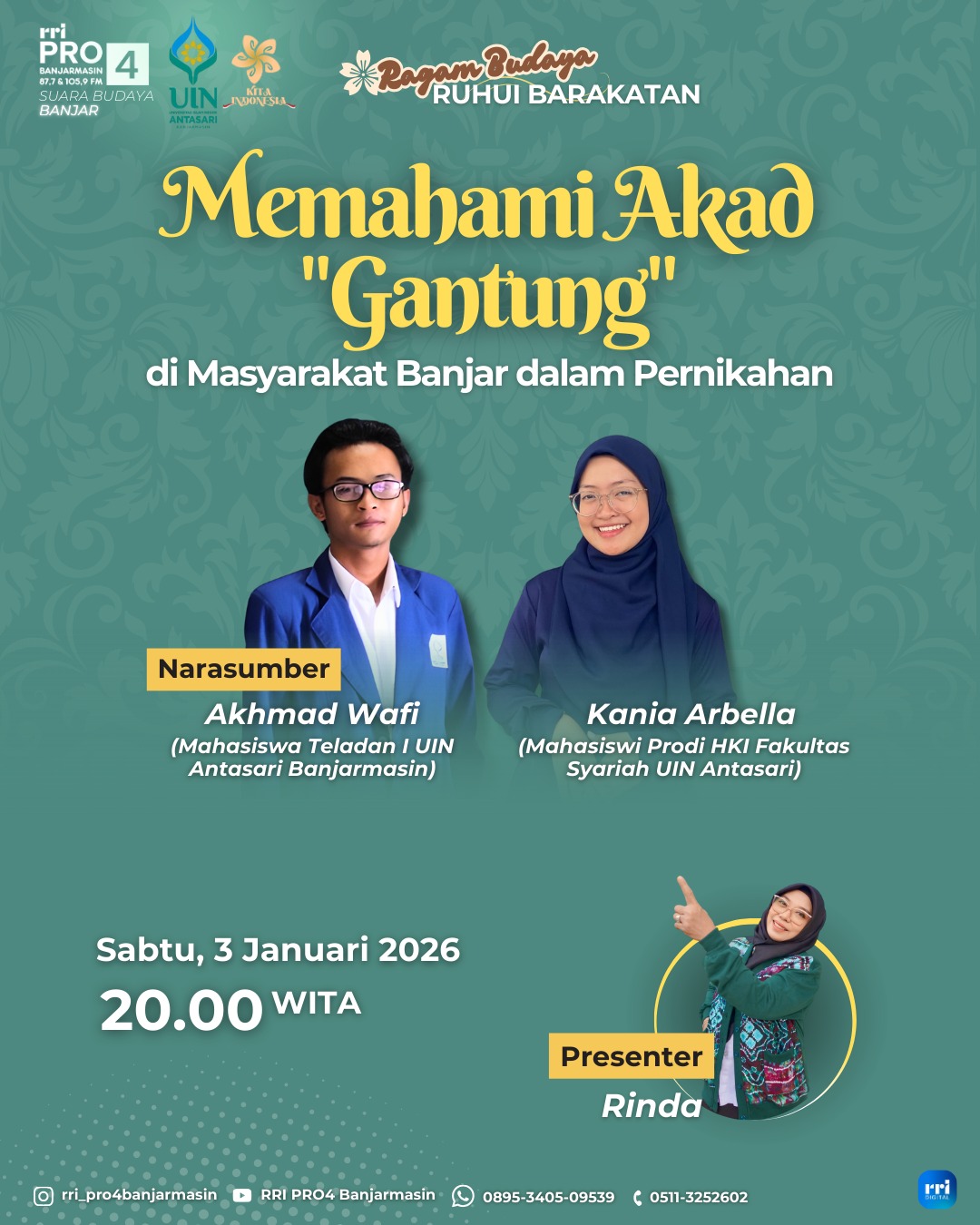 Selamat datang di Fakultas Syariah UIN Antasari Banjarmasin, pusat pengkajian dan pengembangan ilmu hukum yang mengintegrasikan keilmuan Islam dan modernitas, memadukan nilai keislaman dan kebangsaan, berbasis lokal, serta berwawasan global.