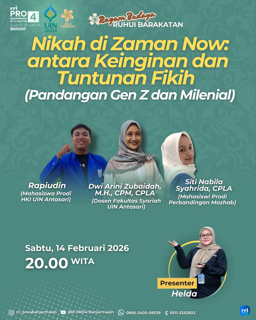 Mari malam mingguan sambil bincang santai dalam RUHUI BARAKATAN “Nikah di Zaman Now: antara Keinginan dan Tuntunan Fikih (Pandangan Gen Z dan Milenial)” bersama Narasumber Dwi Arini Zubaidah, M.H., CPM, CPLA (Dosen Fakultas Syariah UIN Antasari) dan Pendamping Rapiudin dan Siti Nabila Syahrida, CPLA (Mahasiswa Prodi Perbandingan Mazhab Fakultas Syariah UIN Antasari) di Pro 4 FM 87,7 RRI Banjarmasin pukul 20:00 WITA. Selamat mendengarkan dan menonton yang Anda dengarkan. Mohon perkenan untuk like dan komen via Live Chat Youtube RRI Banjarmasin.