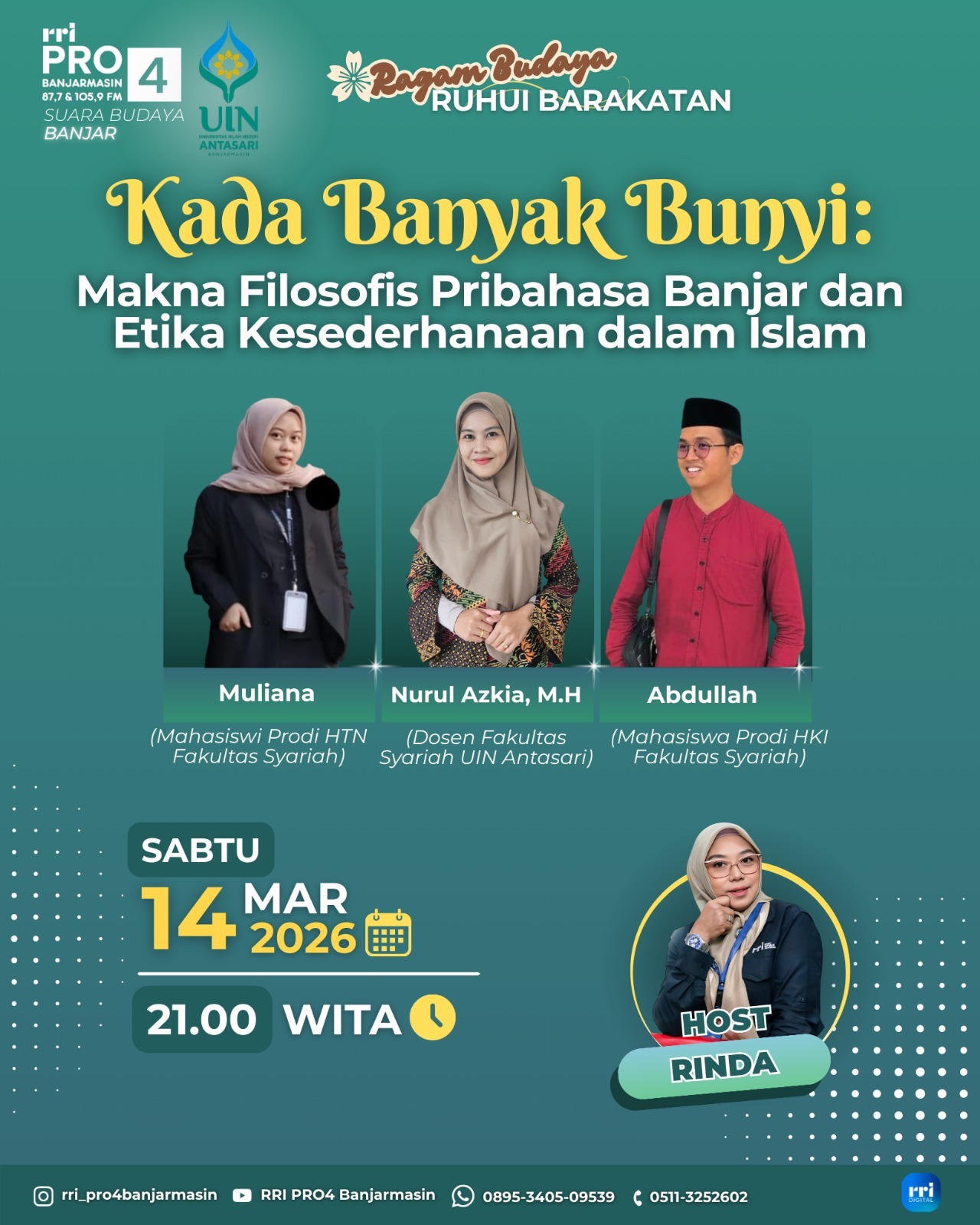 Mari malam mingguan sambil bincang santai dalam RUHUI BARAKATAN “Kada Banyak Bunyi: Makna Filosofis Pribahasa Banjar dan Etika Kesederhanaan dalam Islam” bersama Narasumber Nurul Azkia, M.H (Dosen Fakultas Syariah UIN Antasari) dan Pendamping Abduullah (Mahasiswa Prodi Hukum Keluarga Islam Fakultas Syariah UIN Antasari) dan Muliana (Mahasiswa Prodi Hukum Tatanegara Fakultas Syariah UIN Antasari) di Pro 4 FM 87,7 RRI Banjarmasin pukul 21:00 WITA. Selamat mendengarkan dan menonton yang Anda dengarkan. Mohon perkenan untuk like dan komen via Live Chat Youtube RRI Banjarmasin.
