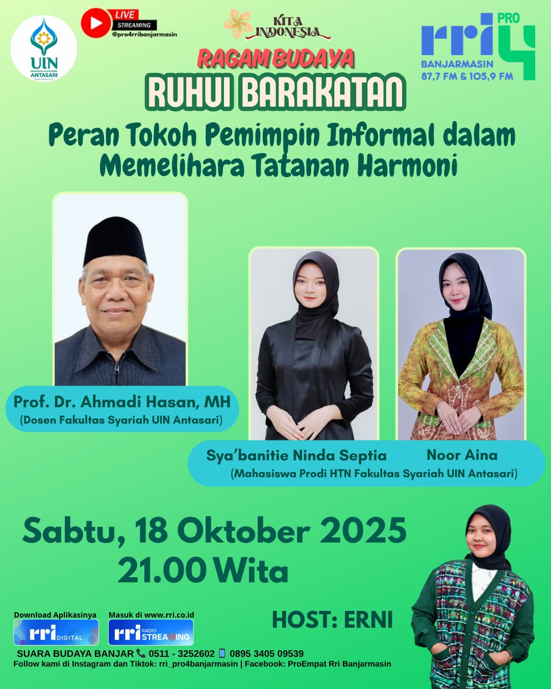 Mari malam mingguan sambil bincang santai dalam RUHUI BARAKATAN “Peran Tokoh Pemimpin Informal dalam Memelihara Tatanan Harmoni” bersama Narasumber Prof. Dr. Ahmadi Hasan, MH (Dosen Fakultas Syariah UIN Antasari) dan Pendamping Sya’banitie Ninda Septia dan Noor Aina (Mahasiswa Prodi Hukum Tatanegara Fakultas Syariah UIN Antasari) di Pro 4 FM 87,7 RRI Banjarmasin pukul 21:00 WITA. Selamat mendengarkan dan menonton yang Anda dengarkan. Mohon perkenan untuk like dan komen via Live Chat Youtube RRI Banjarmasin.