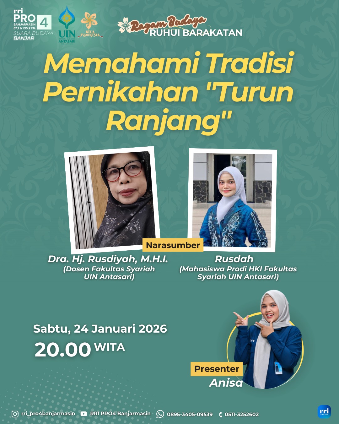 Mari malam mingguan sambil bincang santai dalam RUHUI BARAKATAN “Memahami Tradisi Pernikahan Turun Ranjang” bersama Narasumber Dra. Hj. Rusdiyah, M.H.I. (Dosen Fakultas Syariah UIN Antasari) dan Pendamping Rusdah (Mahasiswa Prodi Hukum Keluarga Islam Fakultas Syariah UIN Antasari) di Pro 4 FM 87,7 RRI Banjarmasin pukul 20:00 WITA. Selamat mendengarkan dan menonton yang Anda dengarkan. Mohon perkenan untuk like dan komen via Live Chat Youtube RRI Banjarmasin.