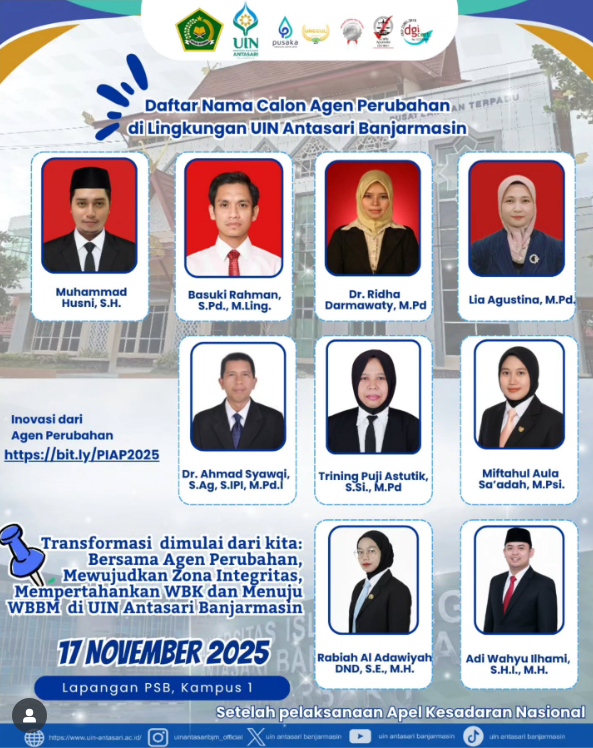 Banjarmasin, 17 November 2025 – Pagi hari ini telah dilaksanakan pemilihan calon agen perubahan sebagai bagian dari upaya memperkuat komitmen Zona Integritas menuju predikat Wilayah Birokrasi Bersih Melayani (WBBM), UIN Antasari telah menetapkan sembilan calon agen perubahan periode 2025–2026 yang siap memaparkan inovasi mereka. Dua di antaranya, Muhammad Husni, S.H. dan Adi Wahyu Ilhami, S.H.I., M.H. berasal dari Fakultas Syariah UIN Antasari Banjarmasin dan membawa visi layanan yang berbasis digital serta budaya pelayanan.
